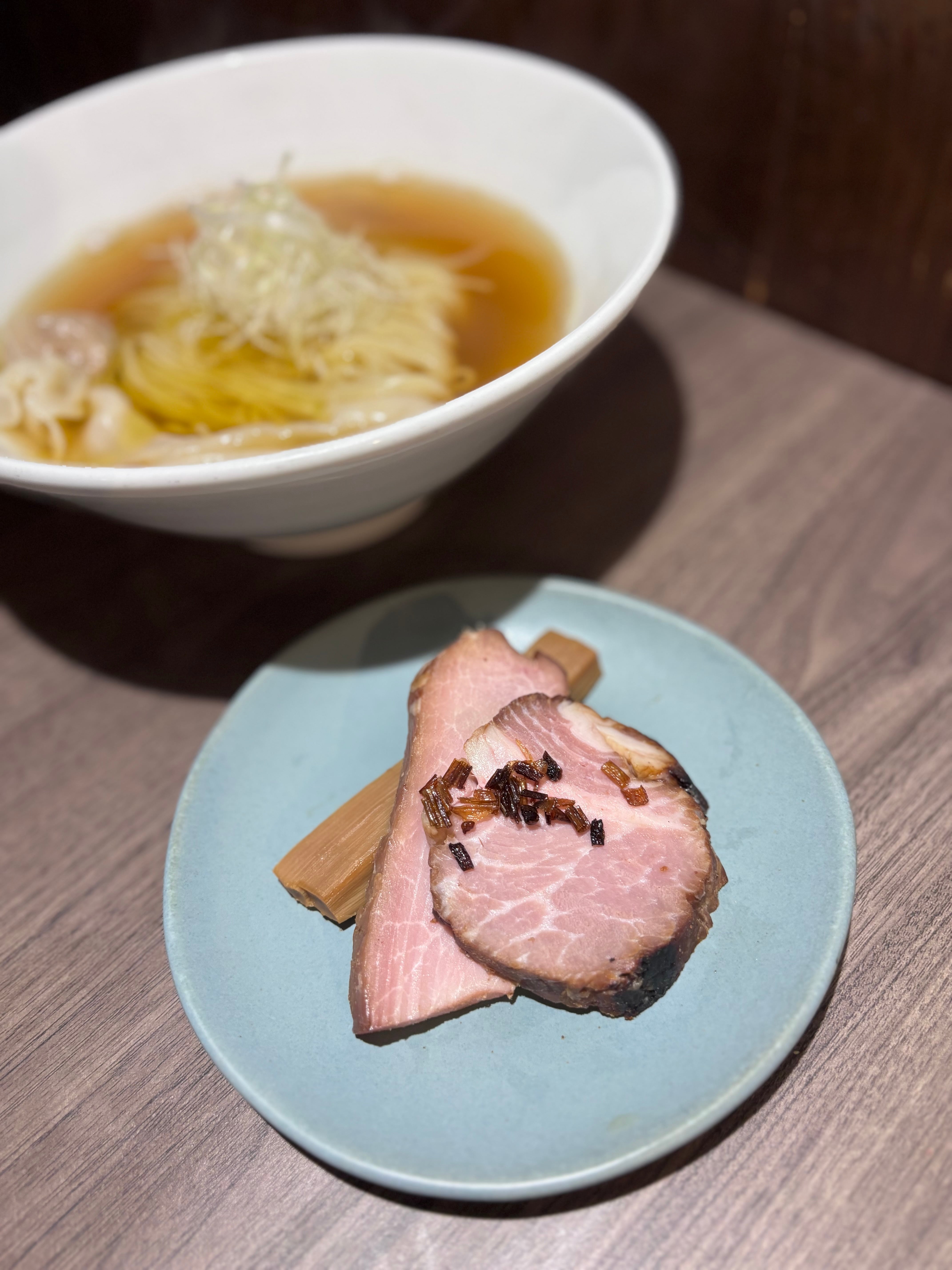麺、スープ、具(三重のおこめ豚ちゃーしゅー2枚とメンマ)、背脂(中華そば 芳醇煮干しのみ)