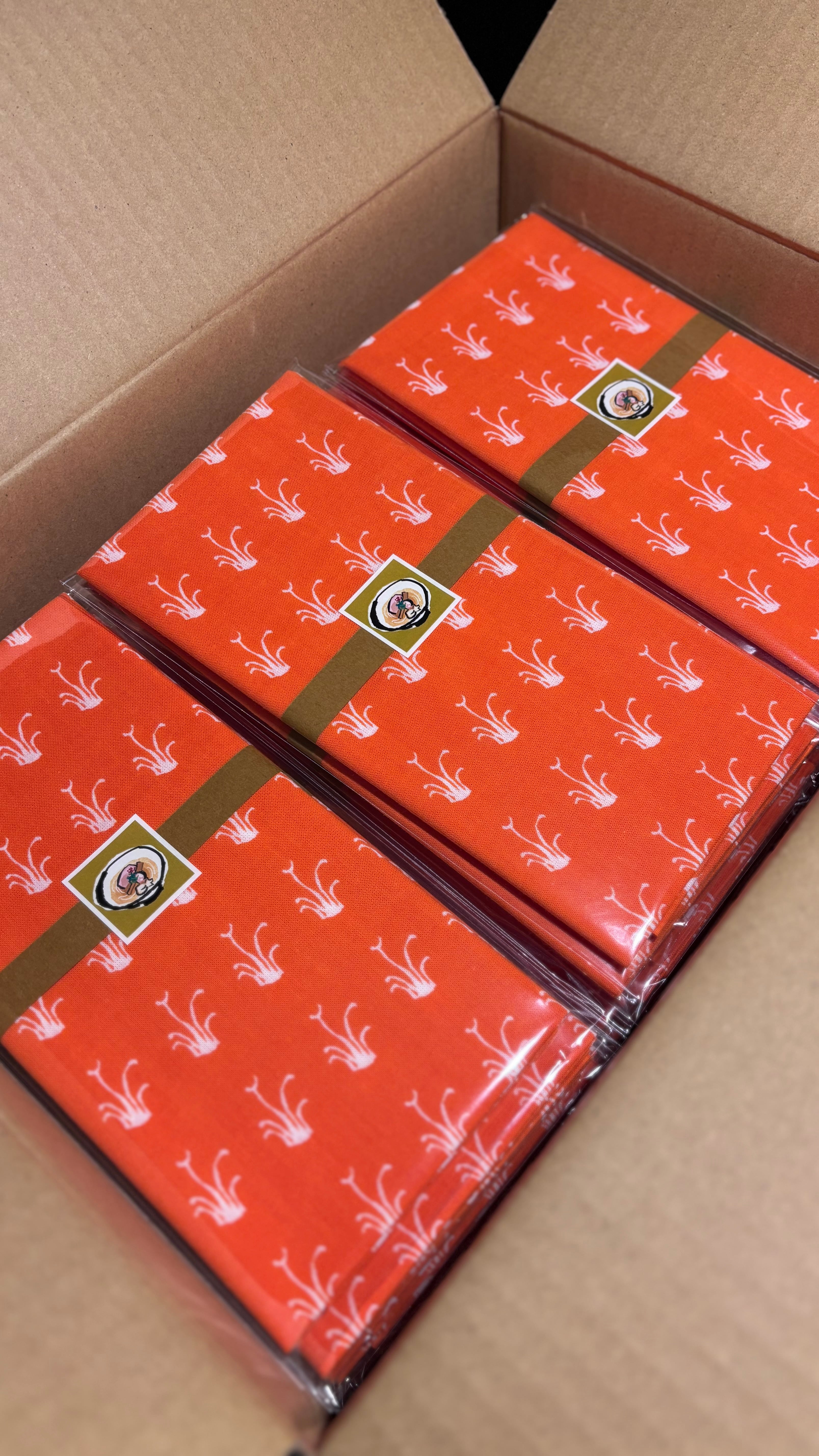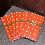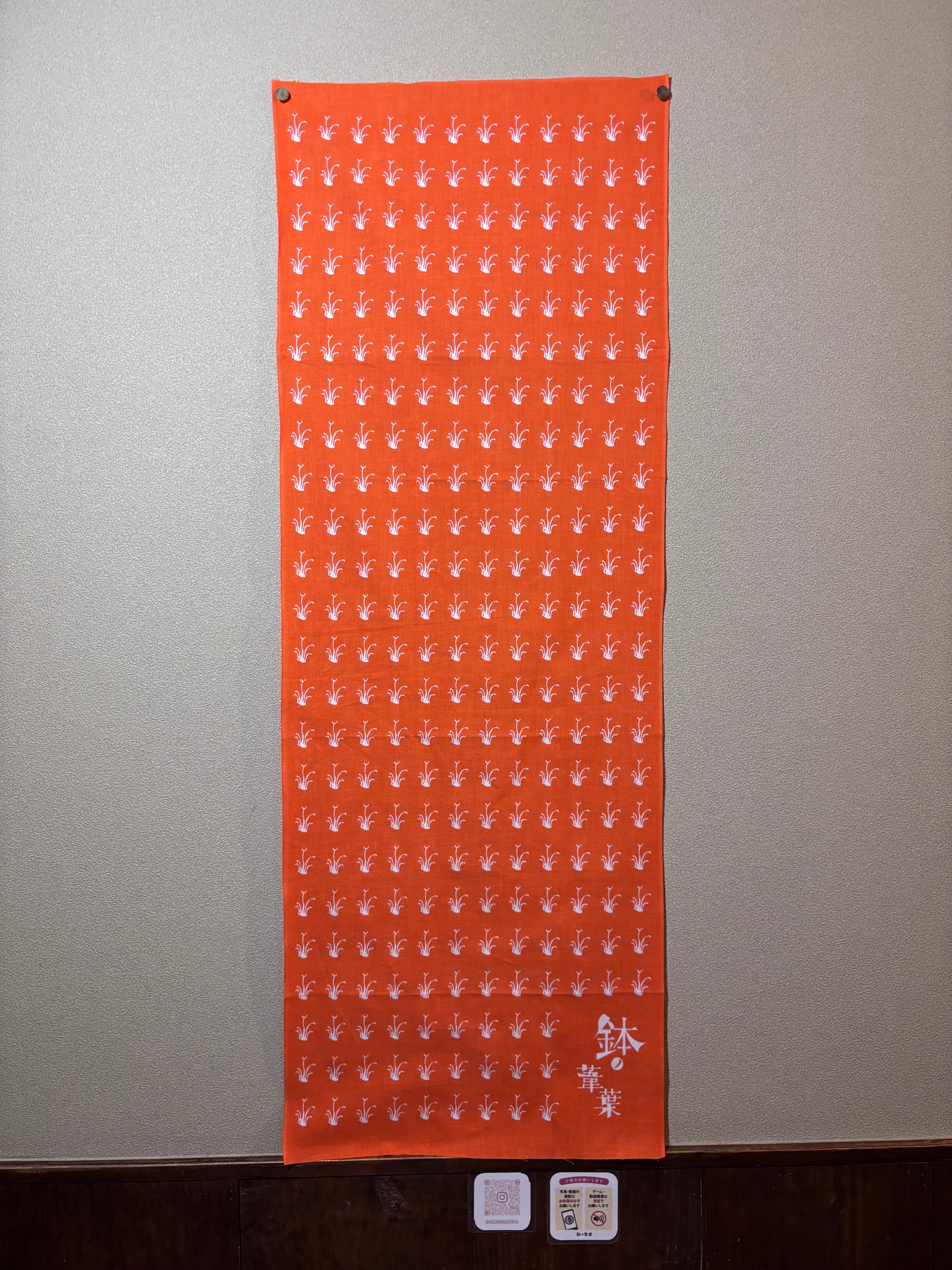 鮮やかなオレンジ色を基調に、葦の葉の伝統文様を並べた、上品で涼やかなデザイン。